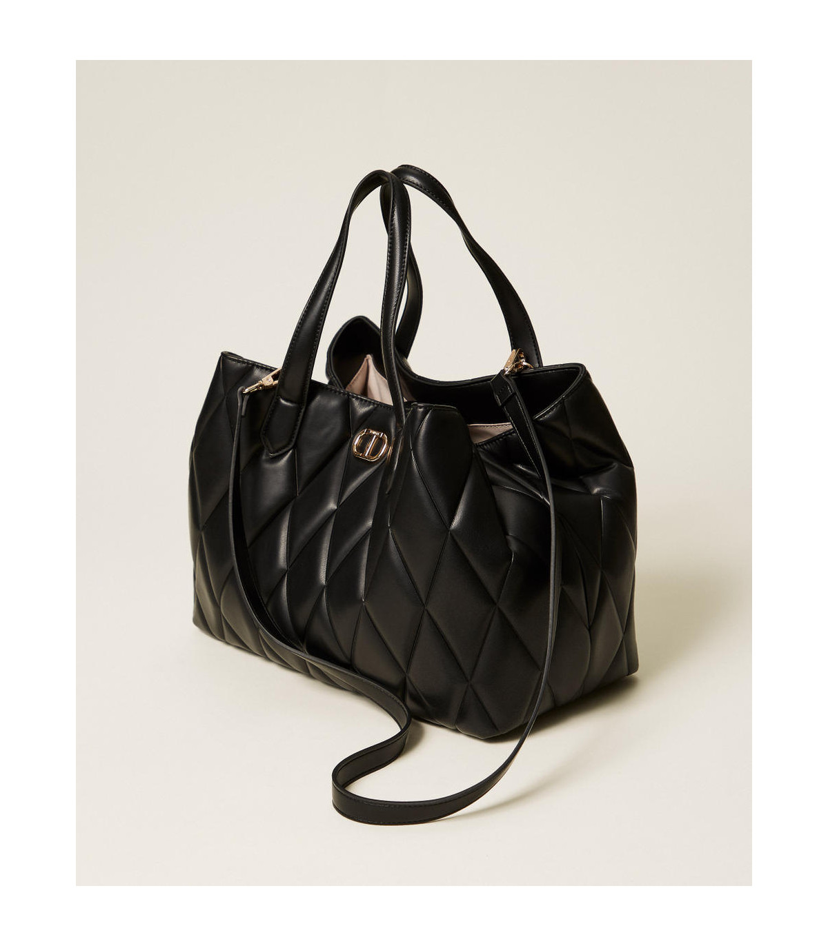 Bolso shopper con efecto de napa de becerro con acabado termosellado acolchado mediante relleno de guata ligera en el interior. Presenta una doble asa de mano, bandolera extraíble para llevarlo al hombro o cruzado, cierre con imán, logotipo Oval T de metal en la parte delantera y forro. Se puede llevar con los laterales abiertos hacia el exterior o plegados en el interior y sujetos con la correa.