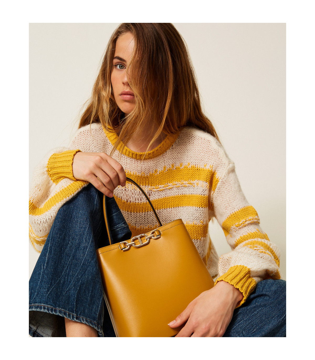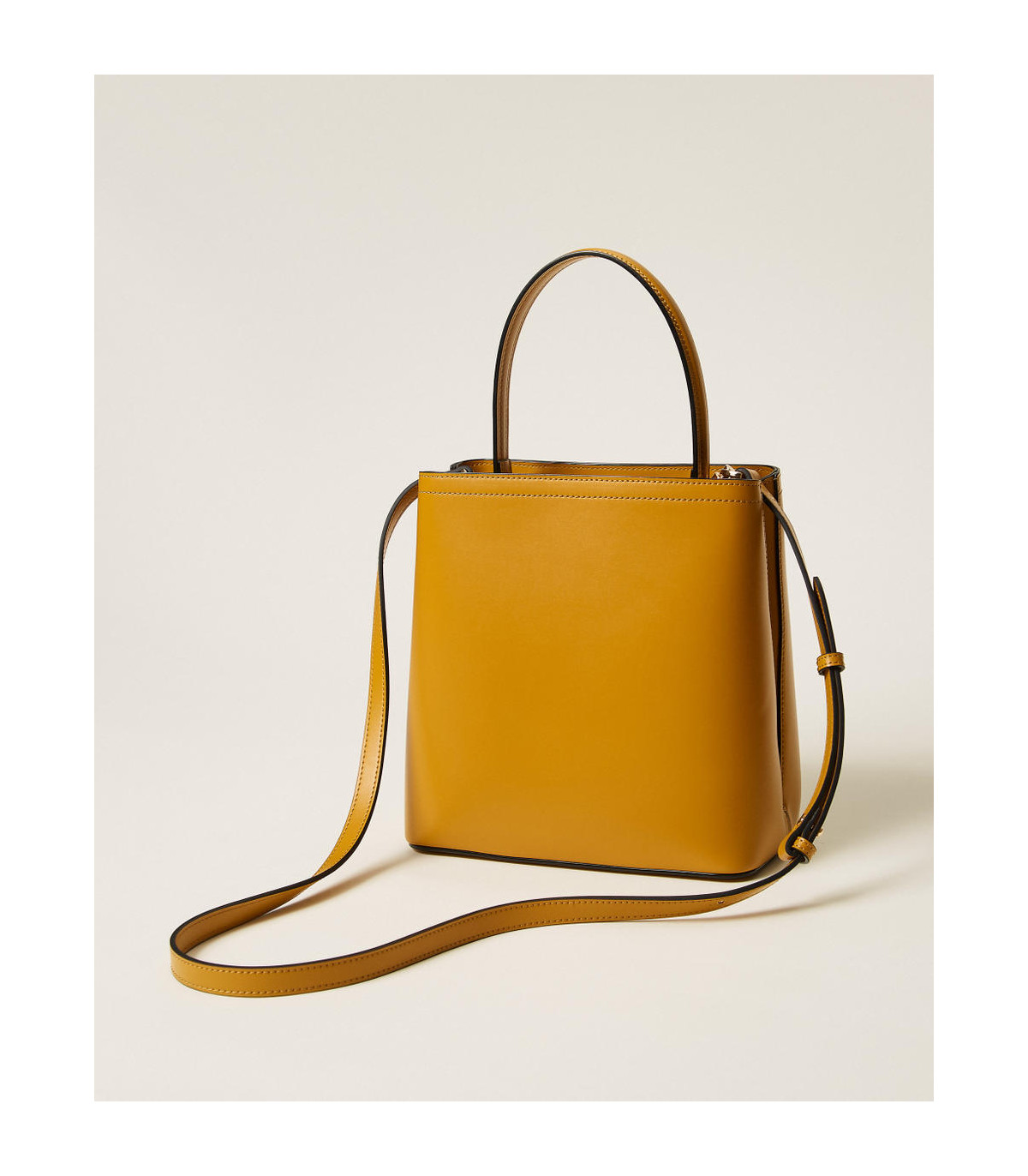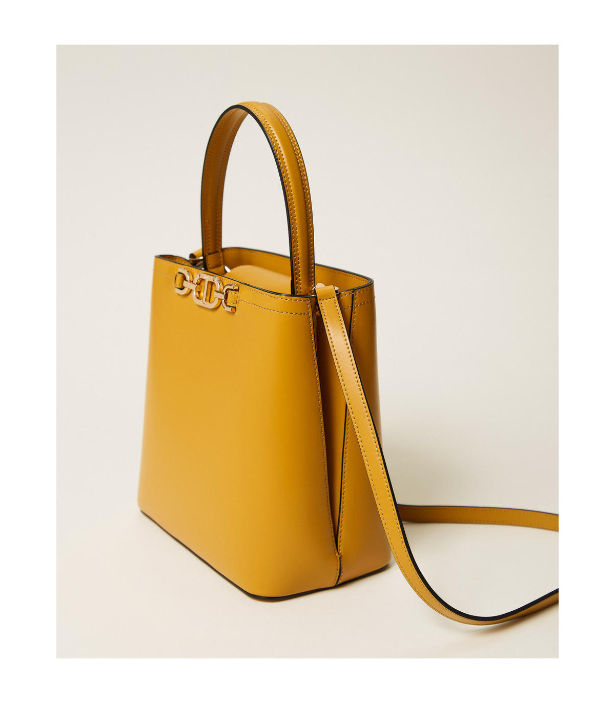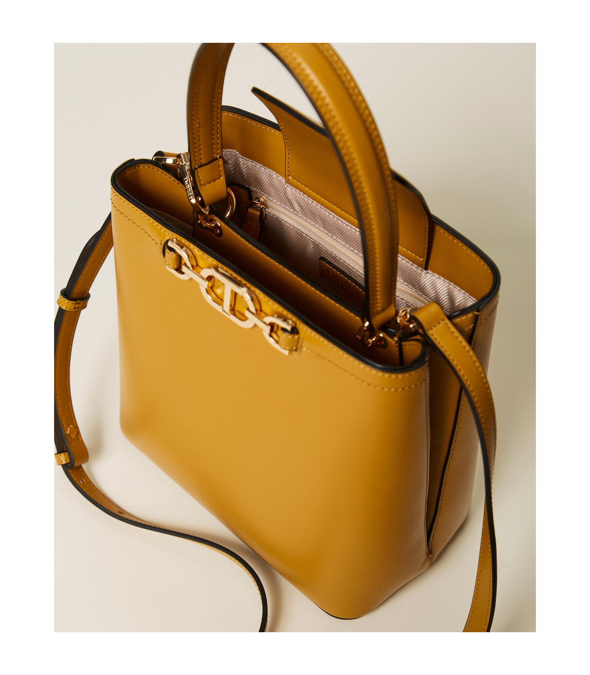 Bolso tipo saco «First Class» con asa superior, de efecto piel de becerro estructurado liso semibrillante con estribo Oval T en el cuadrante delantero. Presenta un asa de mano, correa extraíble para llevar al hombro y cruzado, doble compartimento interno con lengüeta e imán, compartimento con cremallera central y forro.