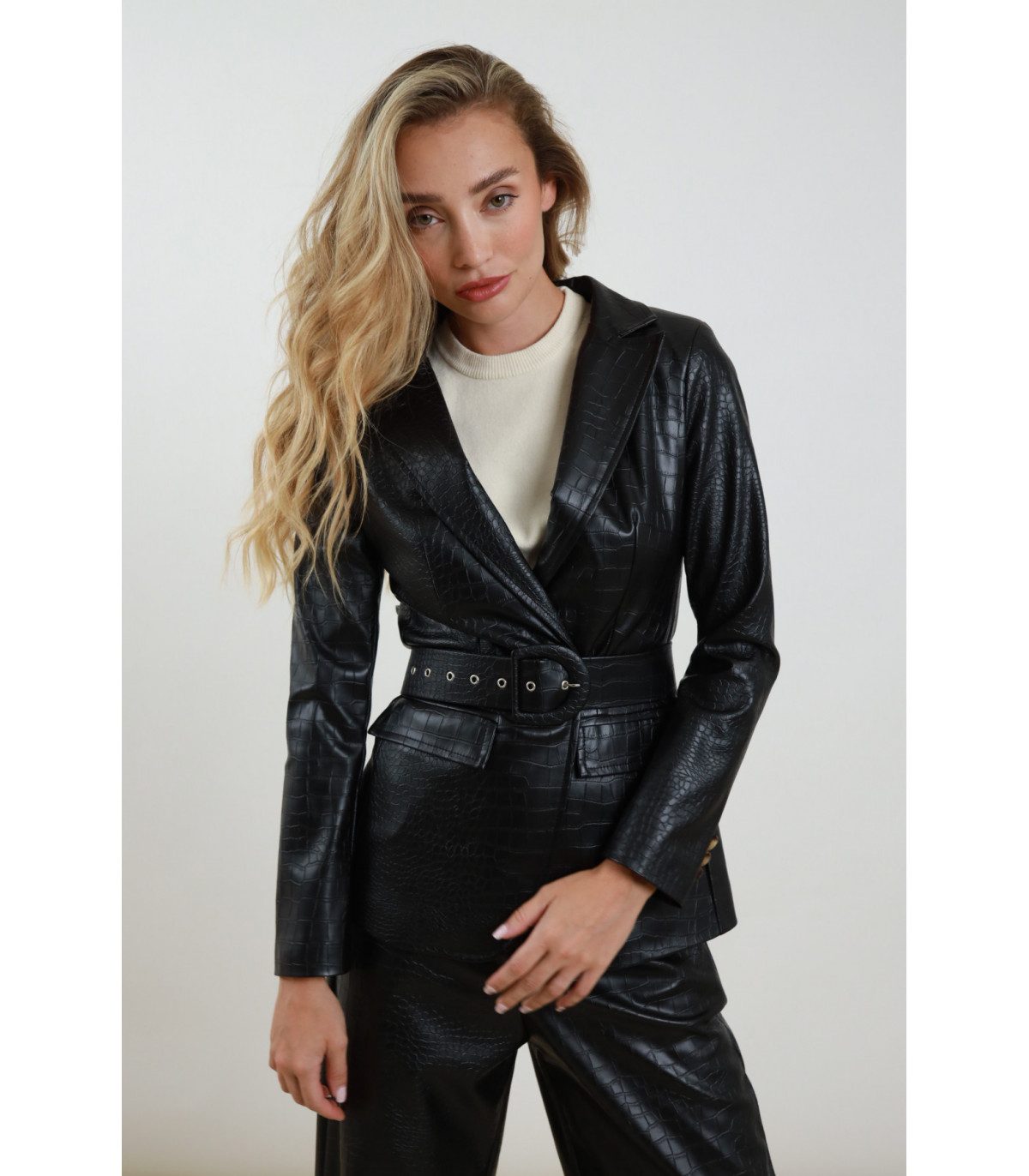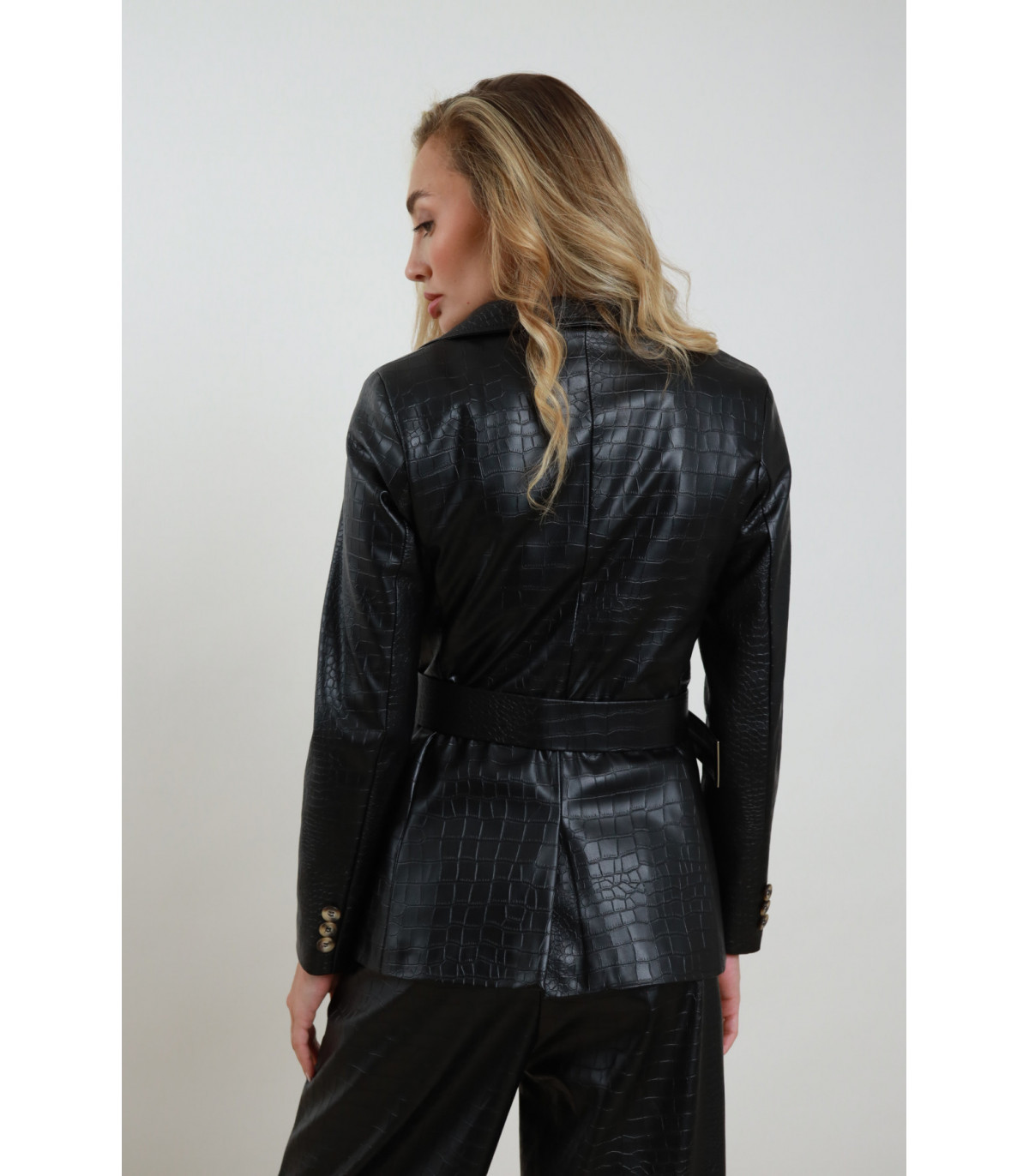 Blazer de piel sintética con estampado de cocodrilo, de botonadura sencilla, con cinturón extraíble y bolsillos con solapa
