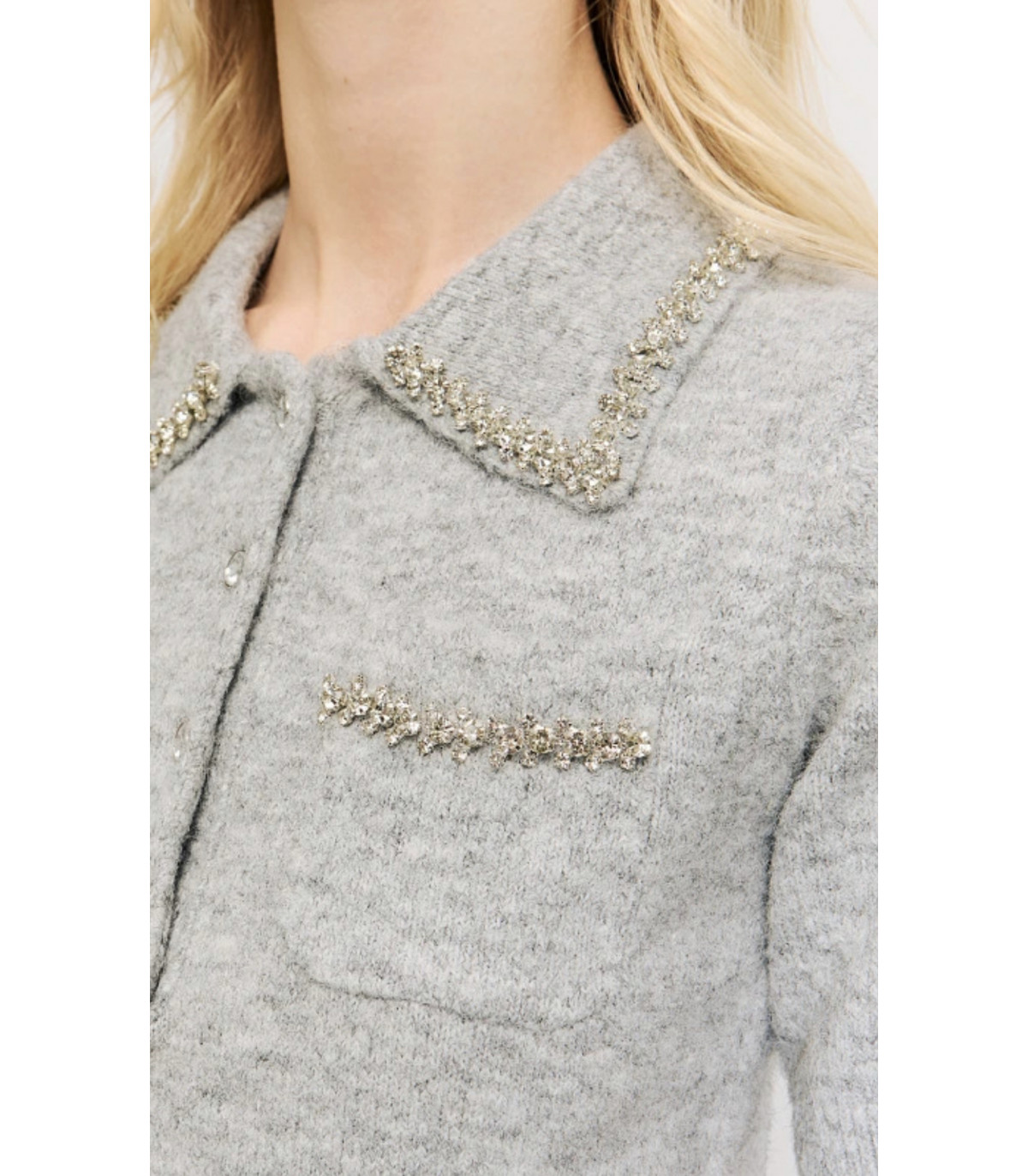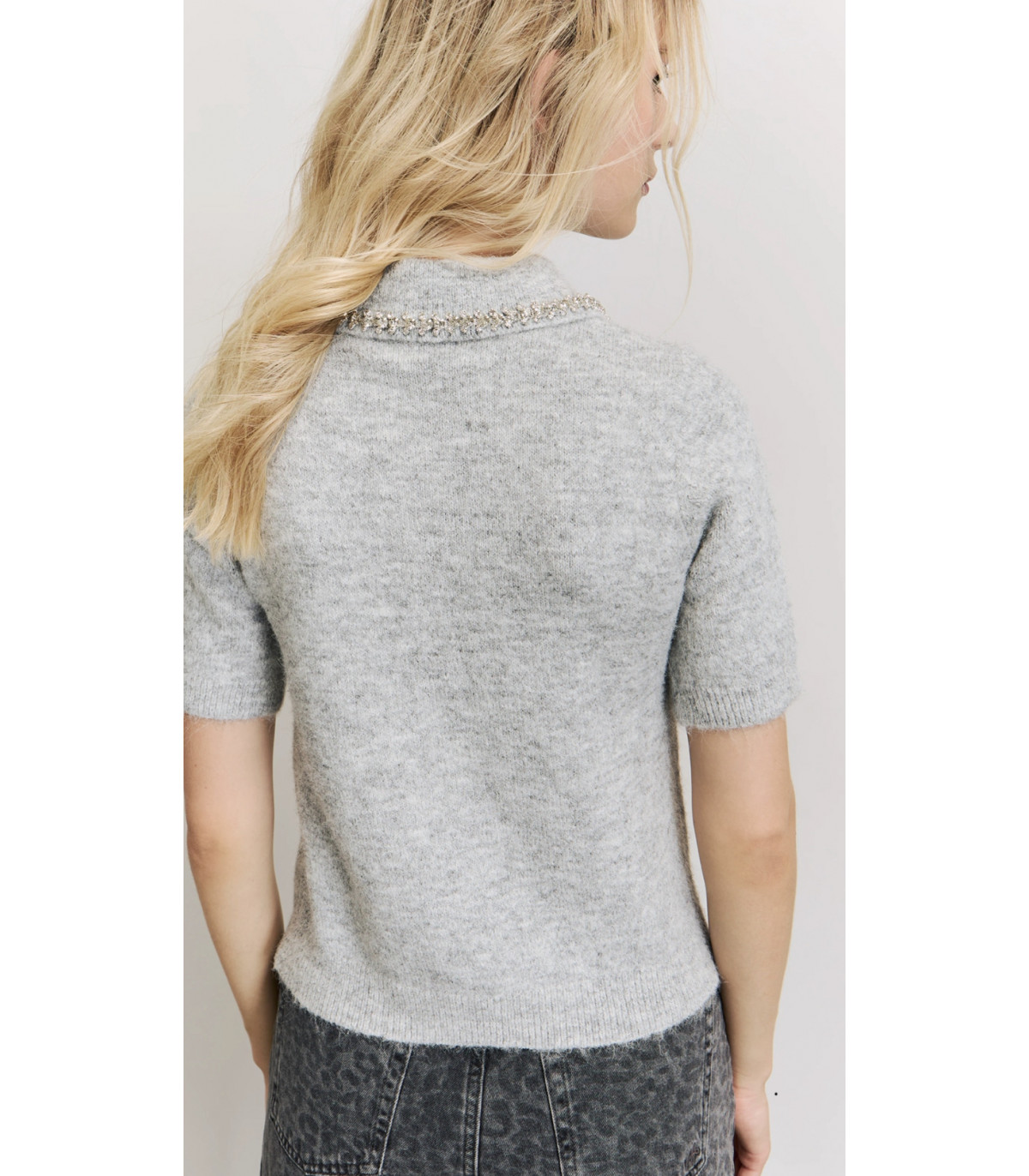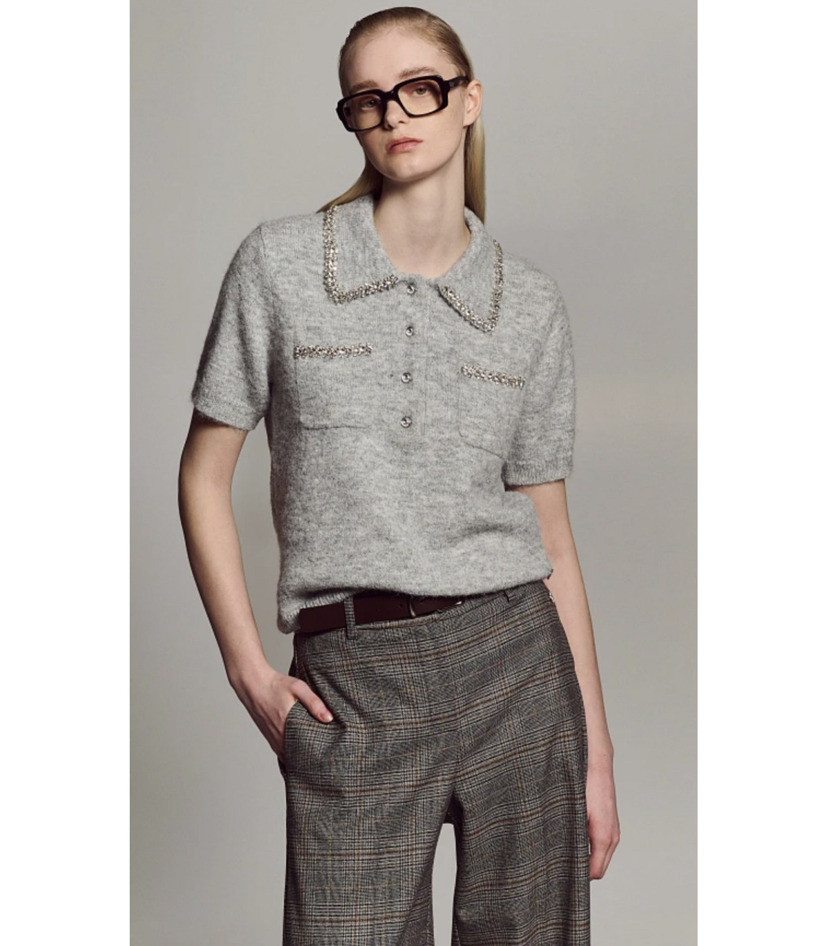 Short sleeve sweater, with decorative shiny stones, with collar, with front pockets, front button closure, regular fit