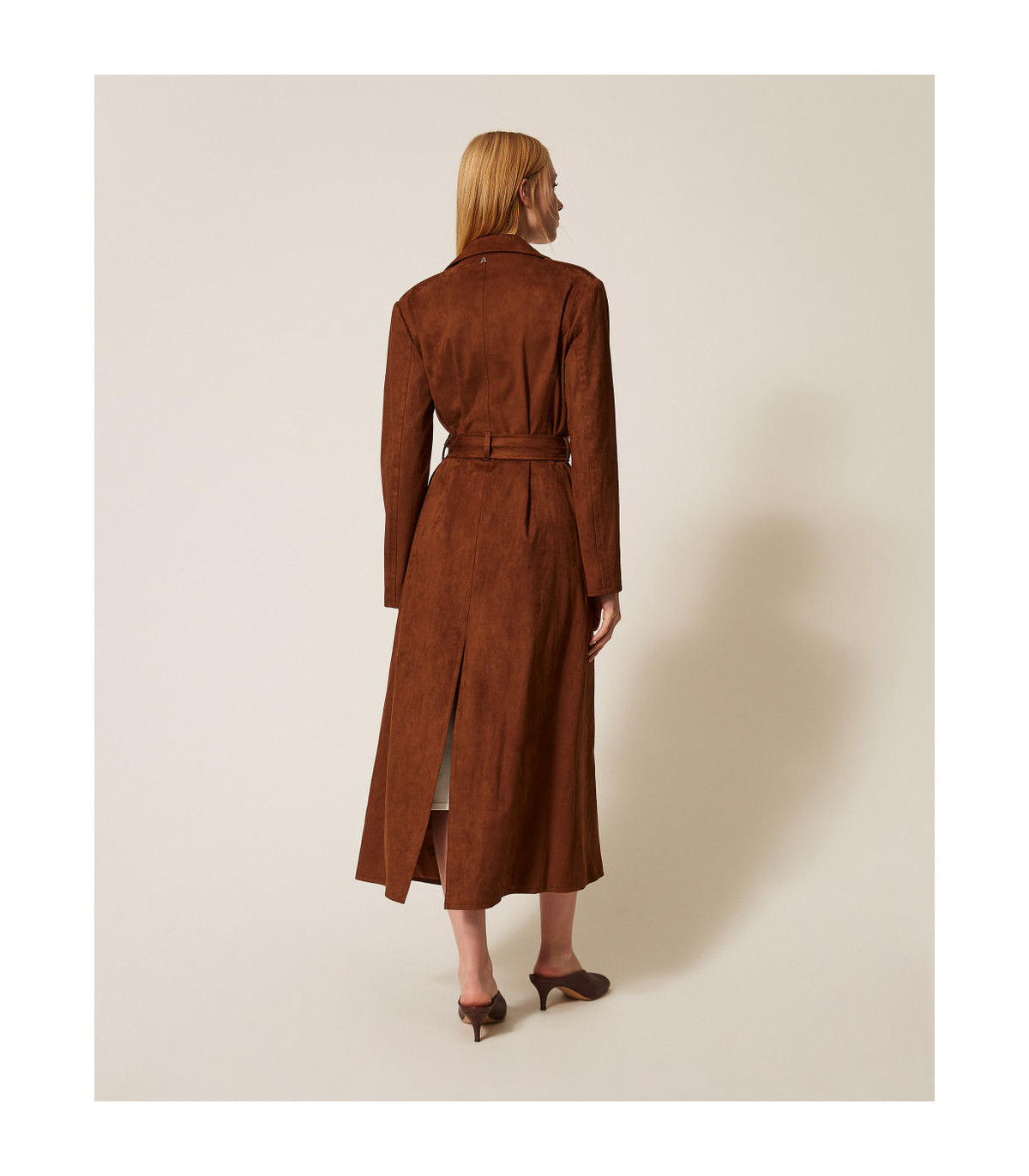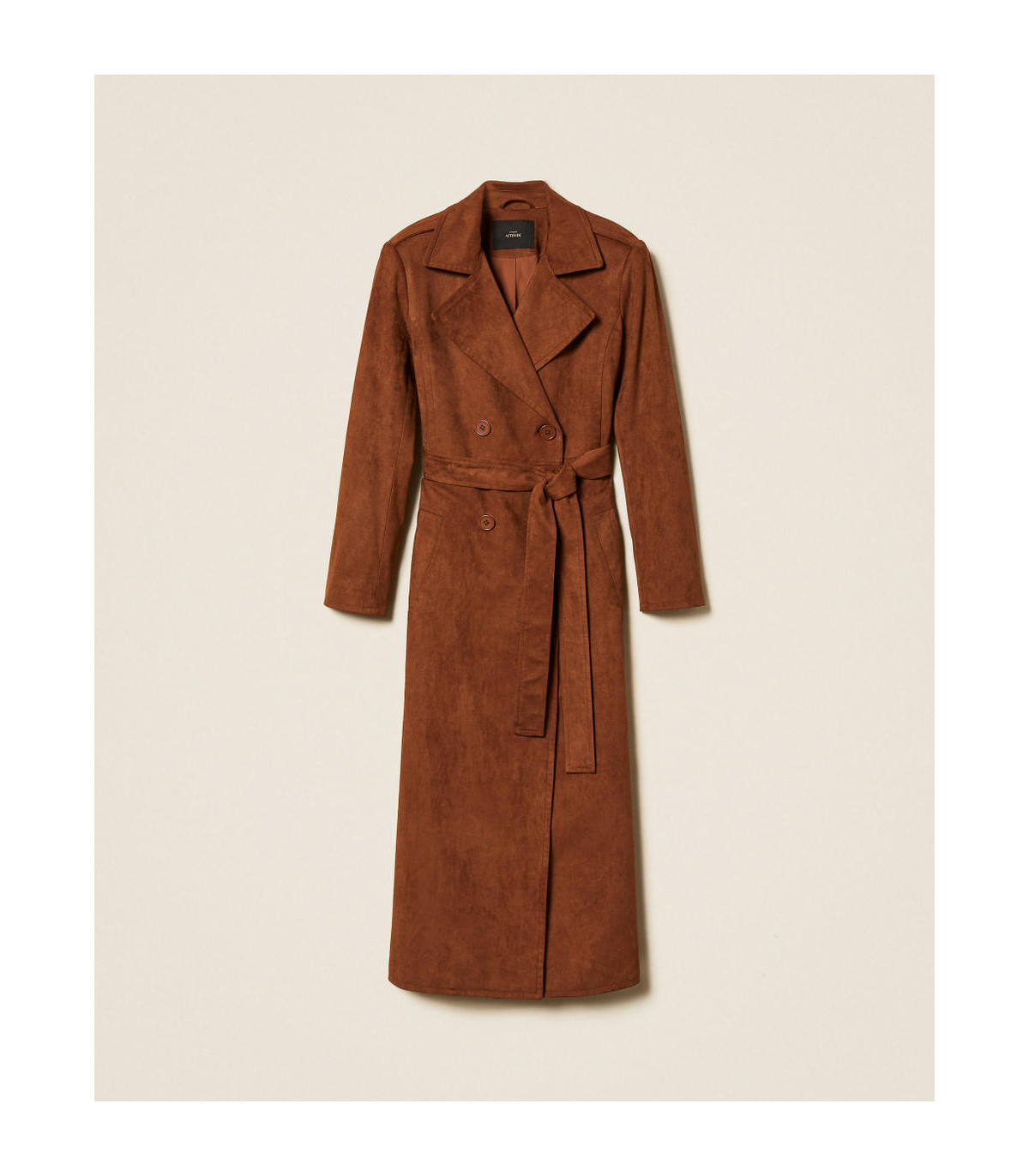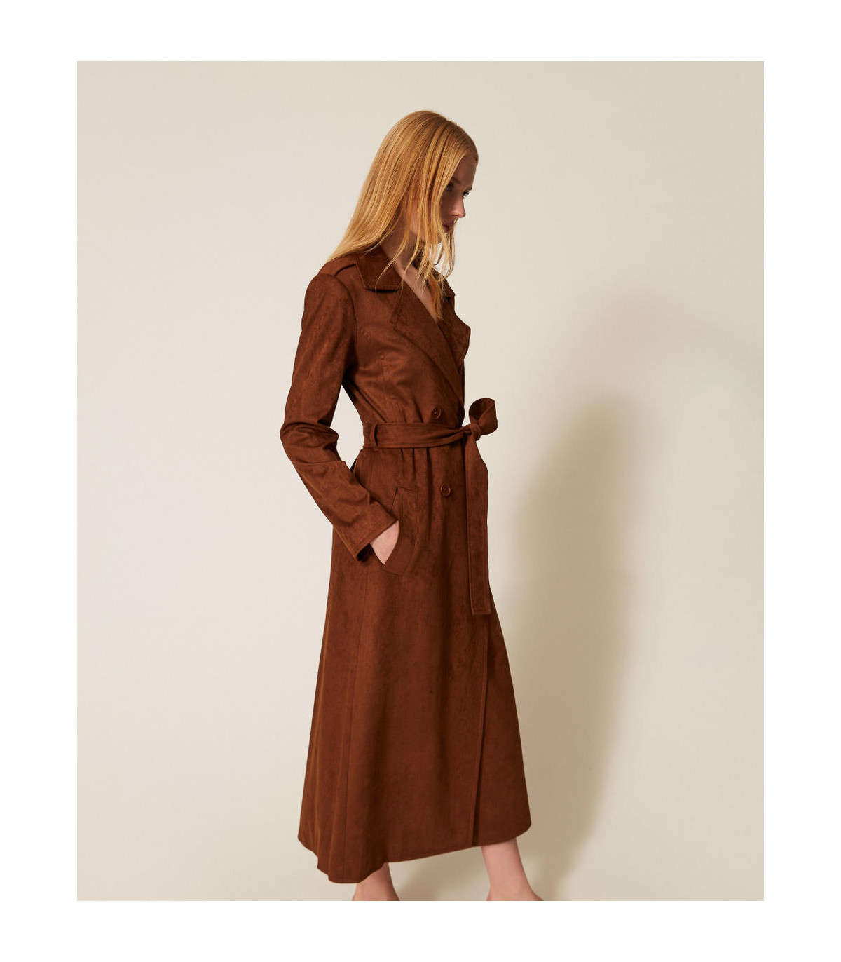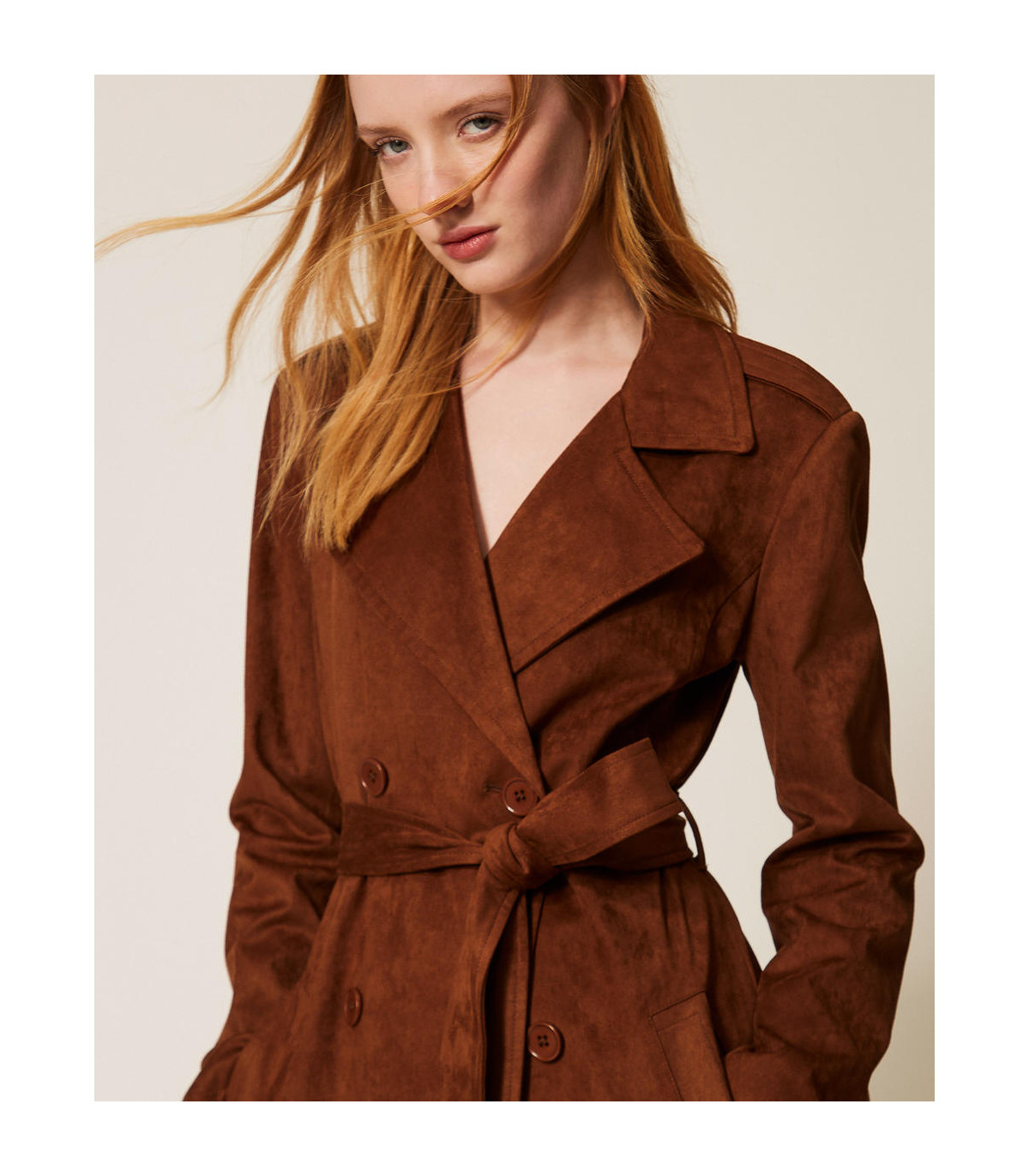 Gabardina de la colección Actitude efecto ante con cinturón extraíble a juego. Tiene cuello con solapas, cierre de doble botonadura con botones a juego, manga larga, bolsillos en los laterales, forro y corte recto