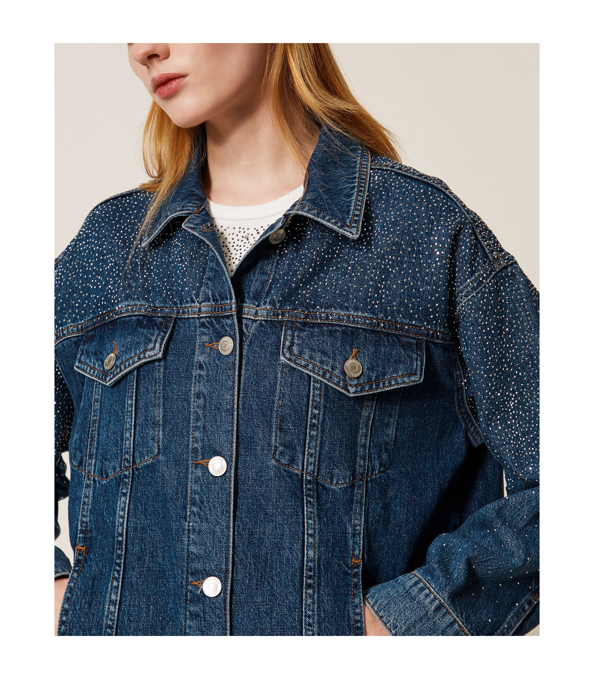 Chaqueta vaquera de la colección Actitude con aplicación de strass termoadhesivo en degradado en el canesú y las mangas. Tiene cuello clásico, manga larga con puños y botón, bolsillos con solapa, cierre con botones con logotipo y clavo, lavado azul lavado y corte holgado